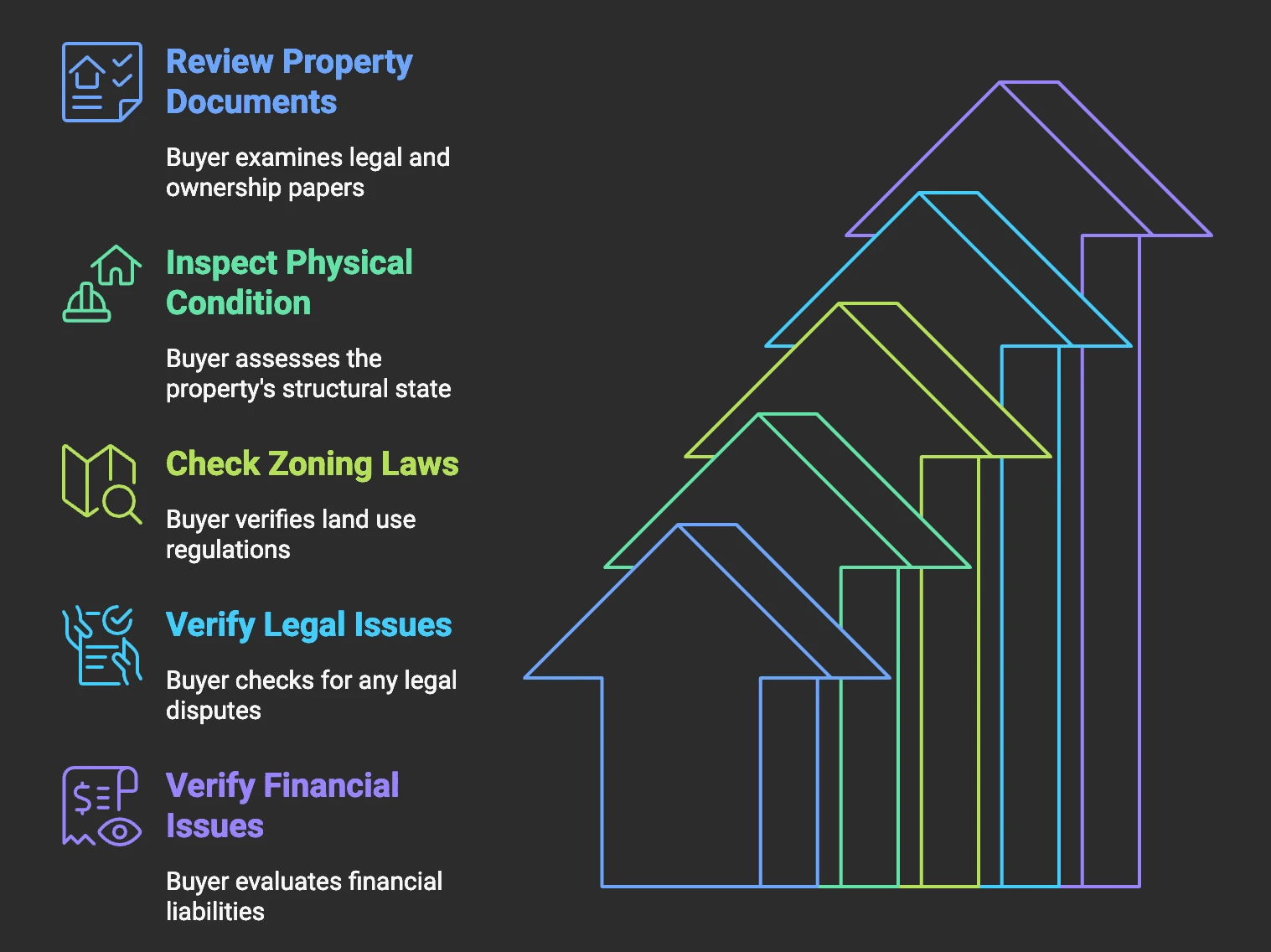 Due Diligence: The careful research and investigation a buyer performs to evaluate a property before completing a purchase. This process typically includes reviewing property documents, inspecting the physical condition, checking zoning laws, and verifying any potential legal or financial issues that could affect the property's value or use.